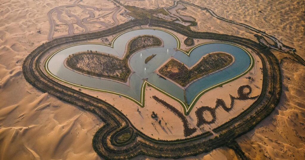 Love Lake Dubai is one of the most photographed spots in the entire UAE. It consists of two artificial lakes shaped like intertwined hearts, large enough to be visible on Google Earth. The surrounding vegetation is arranged to spell out the word “Love” — though you’ll need a drone or aerial view to fully appreciate it.It’s been widely voted among the top romantic places in Dubai, and it’s easy to see why. The atmosphere here feels different — softer, quieter, and somehow more intimate than the main lake area. Couples flock here for sunset walks, anniversary picnics, and peaceful evening strolls.
